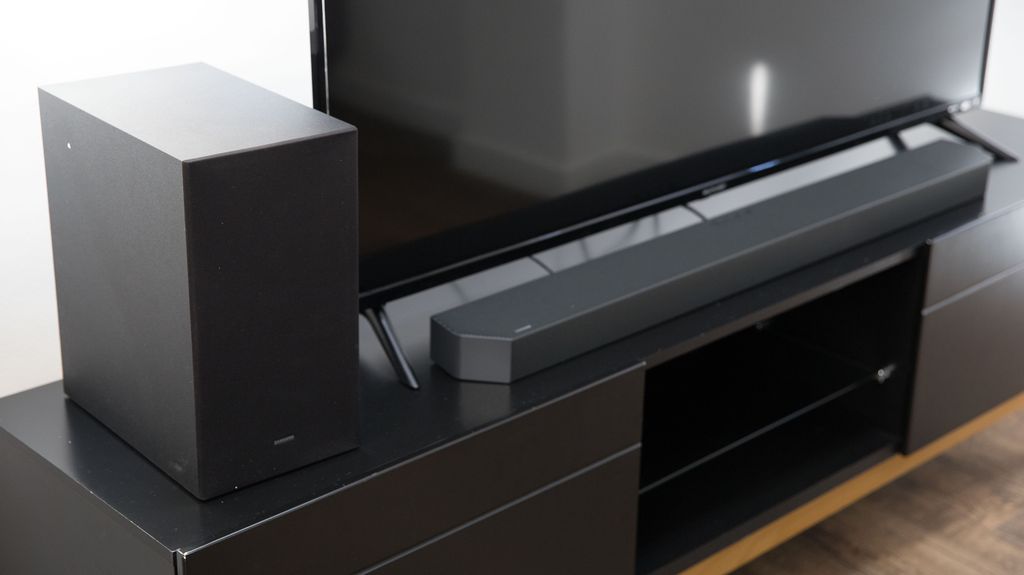 A barra possui 5 alto-falantes para criar uma experiência sonora mais ampla, enquanto o subwoofer sem fio proporciona graves fortes e definidos.
