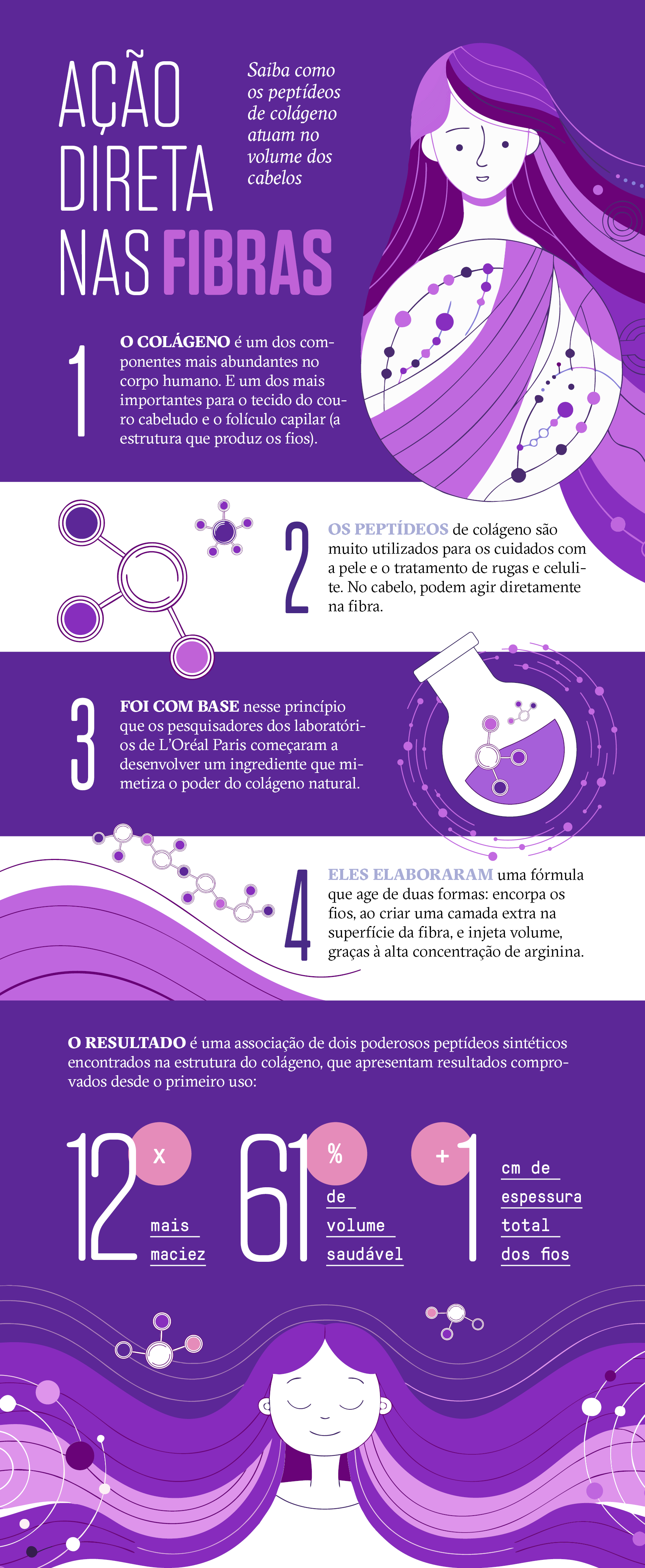 Como informa Victor Ribas, diretor de marketing de cuidados capilares de L’Oréal Paris no Brasil, o exame microscópico do cabelo e da pele ao seu redor inspirou os pesquisadores da empresa. A equipe descobriu que, 4 milímetros abaixo do couro cabeludo, o bulbo capilar é envolvido por uma bainha de colágeno, que fortalece naturalmente a fibra capilar por dentro. Isso inspirou uma inovação: usar um revestimento de peptídeo de colágeno, com alta afinidade pelo cabelo, prolongado ao redor da parte externa da fibra, para agir como um “exoesqueleto”, capaz de sustentar o cabelo da raiz às pontas para um volume leve.