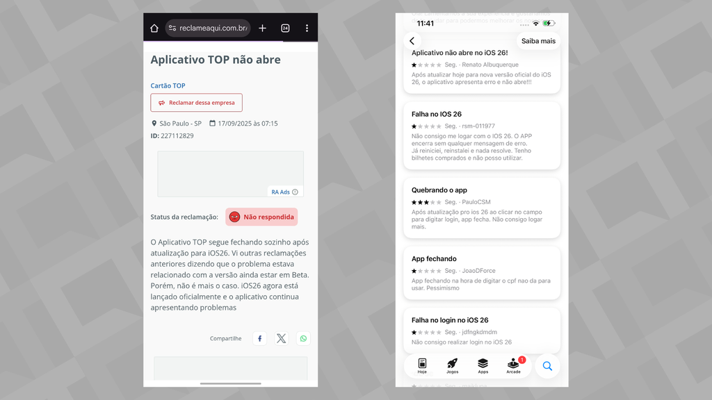 O site Reclame Aqui lista queixas recentes de pessoas que instalaram o iOS 26 e não conseguiram usar a ferramenta para compra de bilhetes. Por fim, a própria página do software na loja da Apple tem comentários de pessoas que passam pela mesma situação.