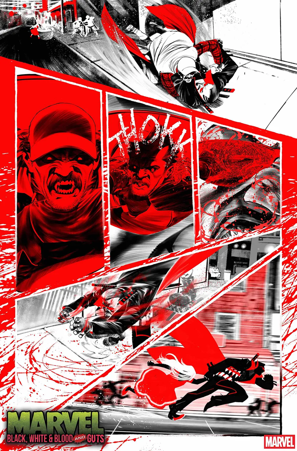 Nesta semana, a Marvel Comics revelou as primeiras páginas de Marvel: Black, White & Blood and Guts #1, nova série limitada em formato de antologia que leva o conceito da linha Black, White & Blood a um patamar ainda mais sangrento. A proposta segue a fórmula já conhecida: histórias de heróis hardcore contadas em preto, branco e vermelho — mas agora com uma dose extra de violência gráfica.