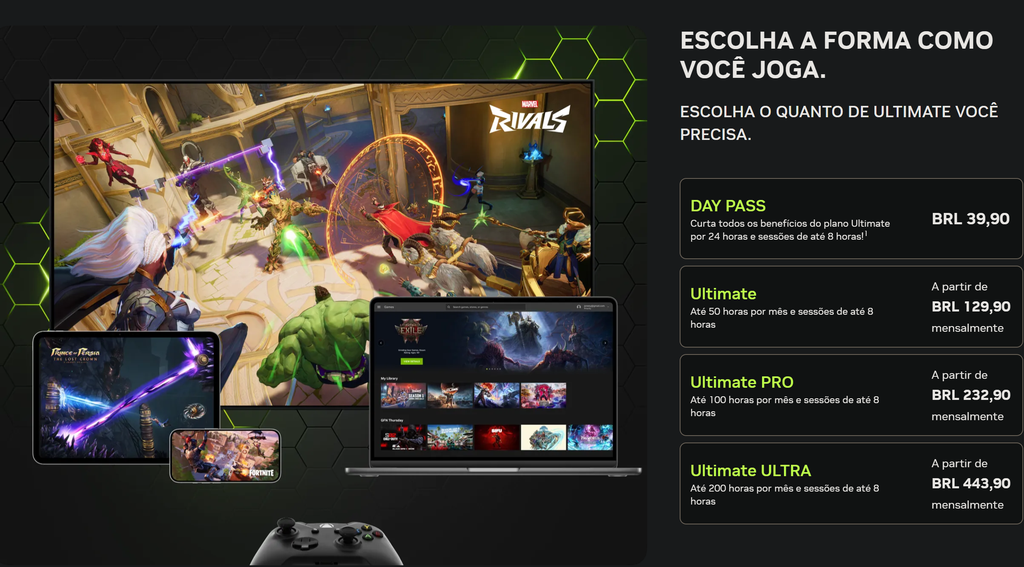 Em vez de processar o jogo no seu hardware, ele roda em supercomputadores equipados com placas GeForce RTX na nuvem e transmite a imagem para você via internet, em tempo real. Isso permite rodar jogos pesados (AAA) com gráficos no máximo em notebooks básicos, Macs, smartphones ou TVs, sem investir em peças caras.