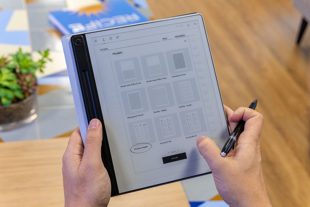 É possível criar cadernos de diferentes tipos, seja todo em branco, com linhas, quadriculado, pontilhado e até com funções pré-definidas, como lista de tarefas, agenda, entre outros.