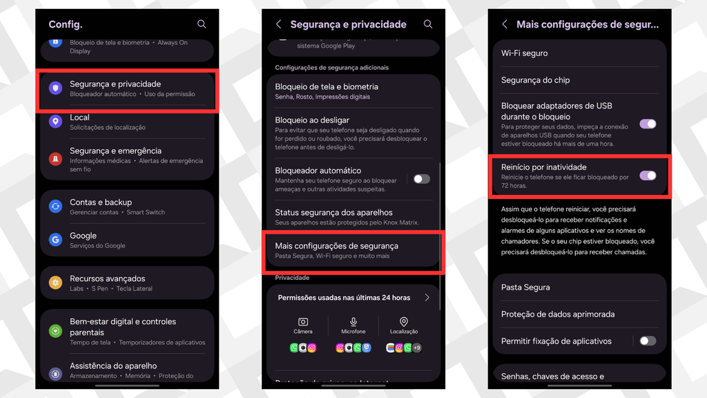 Celulares da Samsung têm um recurso de segurança chamado “reinício por inatividade”, ideal para preservar dados pessoais em situações de perda ou roubo. Após identificar que o aparelho está inativo por muito tempo, o sistema automaticamente reinicia e oculta notificações.