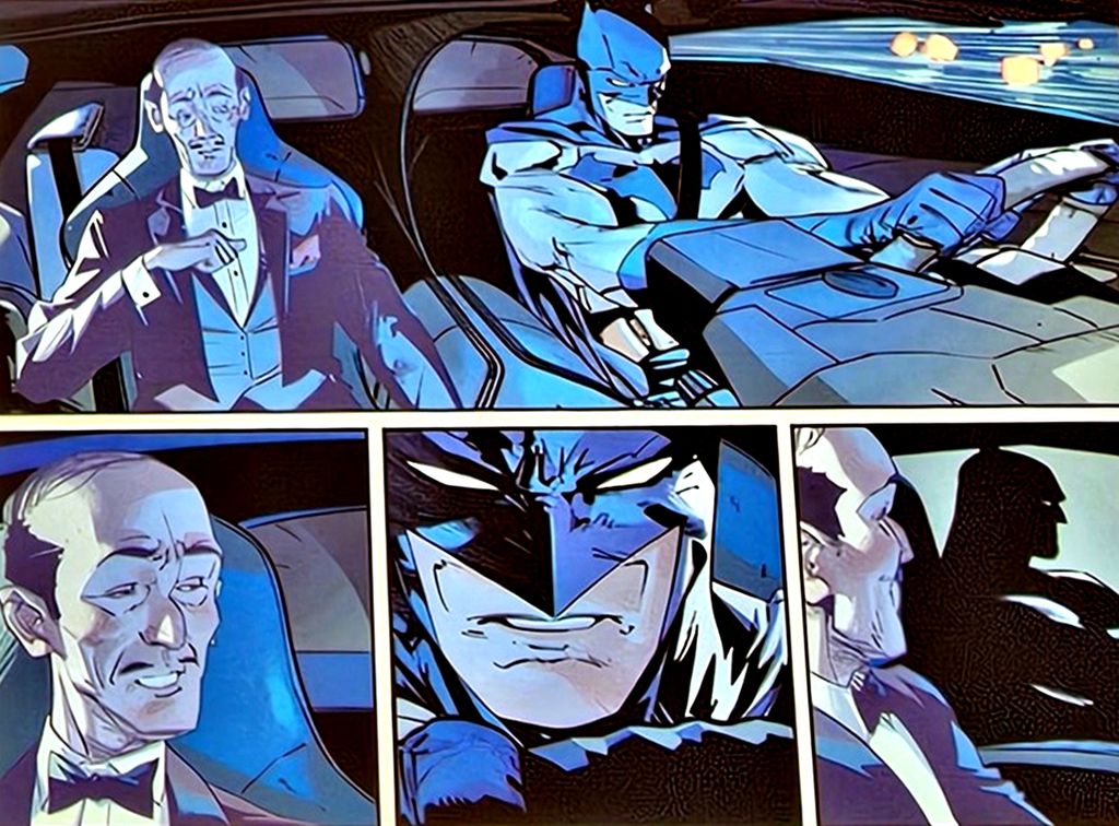 Na edição, Batman é apresentado em ação pelas ruas de Gotham City em seu novo Batmóvel — e, ao seu lado, está Alfred Pennyworth. O mordomo aparece em sua clássica forma: terno impecável de três peças, bigode fino e a postura que fãs conhecem há décadas.