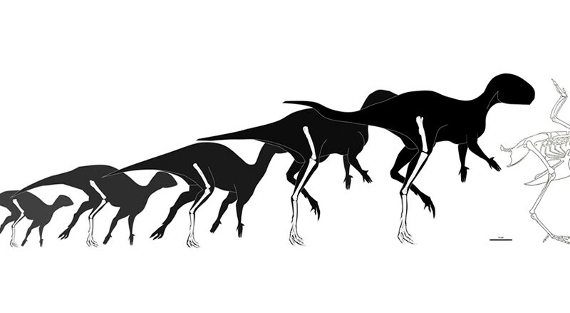 Trajetória de crescimento de<em> Foskeia pelendonum</em>, comparada à de uma galinha adulta (no final, com o esqueleto completo).Dieudonné et al. 2026/Divulgação