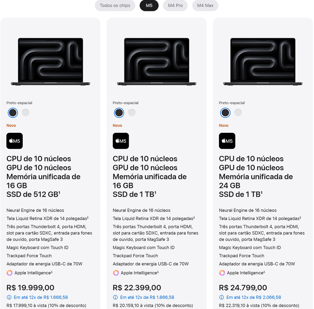 O novo MacBook Pro de 14 polegadas com chip M5 já está disponível para pré-venda nas cores “preto-espacial” e prata, com as entregas começando no dia 22 de outubro. O preço inicial é de R$ 19.999 e vai até R$ 24.799, dependendo da configuração.
