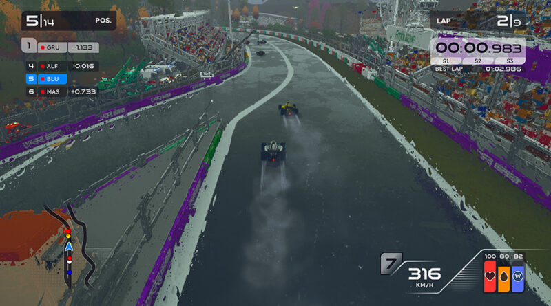 O visual do jogo, que remete à era 16 bits, pode dar a impressão de que ele é mais simples. Não é. Você tem de gerenciar o desgaste de pneus e o consumo de combustível durante as corridas, além de lidar com reviravoltas típicas da Fórmula 1 – como o clima, que muda sem aviso.