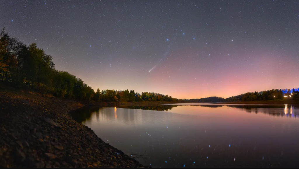 Outra imagem de Horálek também capturou auroras suaves avermelhadas no horizonte, criadas pela mesma tempestade solar que iluminou o céu escocês. O contraste entre o brilho esverdeado do cometa e o tom rosado do fundo celeste reforça a grandiosidade do momento: