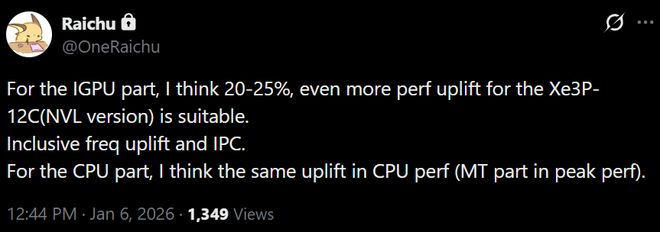 OneRaichu é um conhecido leaker de assuntos de hardware de PC, e ele surge agora para afirmar que a geração Nova Lake, que será a próxima geração de processadores para PC de mesa (e que pode ter versão mobile também), terá a implementação do Xe3P com 12 núcleos entregando entre 20 e 25% em cima do que os Core Ultra 300 conseguem entregar nos notebooks.