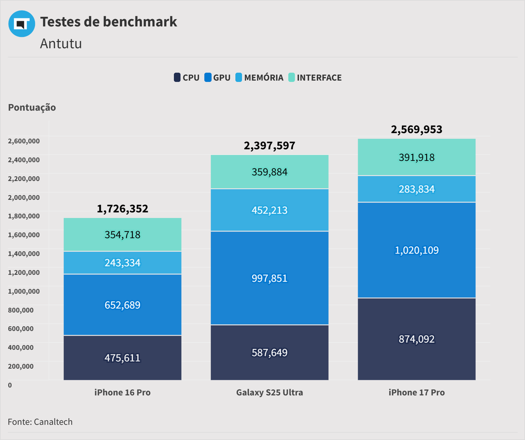 Como comparação, esse número é superior ao do Galaxy S25 Ultra, que marcou 2,3 milhões no mesmo app. Essa é uma grande conquista, visto que há gerações os celulares da Samsung fica à frente da Maçã em benchmark.