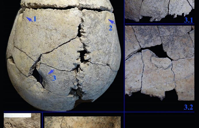O que chamou a atenção dos pesquisadores foram as lesões no crânio. O topo e as laterais da cabeça apresentam perfurações profundas, além de marcas de compressão e depressões no osso que não se parecem com ferimentos causados por armas humanas nem com danos ocorridos após a morte.