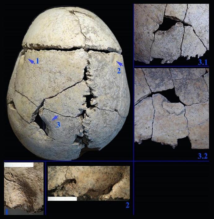 Algumas dessas marcas atravessaram completamente o osso do crânio, atingindo o interior da cavidade craniana. Em um dos pontos, um fragmento ósseo se soltou e acabou soldado novamente à parte interna do crânio durante o processo de cicatrização.