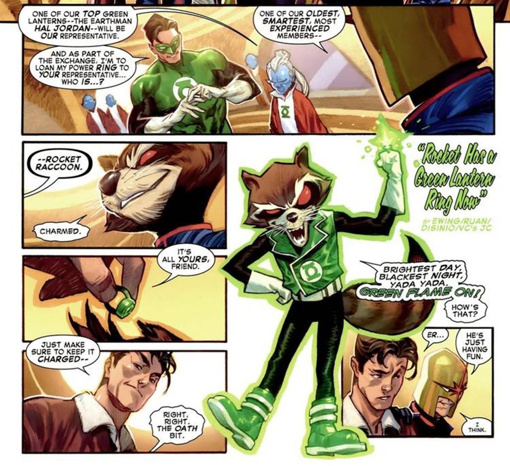 Rocket Has a Green Lantern Ring Now, escrito por Al Ewing e ilustrado por Dike Ruan, apresenta uma espécie de intercâmbio cultural entre os Guardiões do Universo da DC e os Guardiões da Galáxia da Marvel.