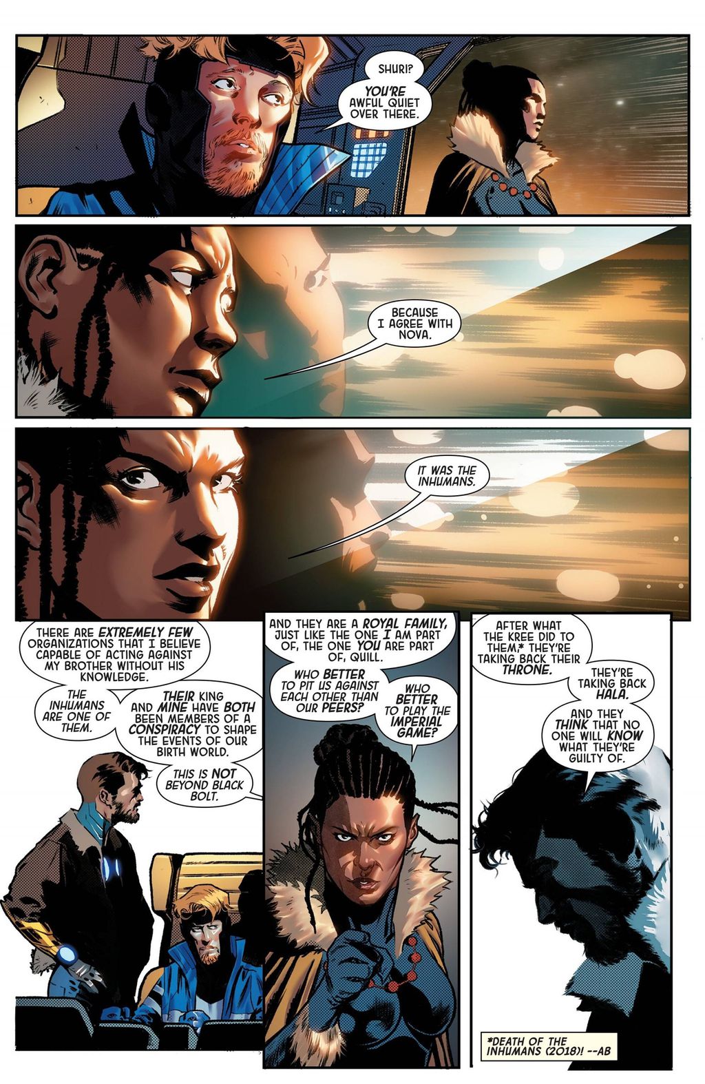 Enquanto Peter Quill, o Senhor das Estrelas, e o Nova Richard Rider investigam sem saber quem são os verdadeiros culpados, surge a suspeita de que a Família Real dos Inumanos estaria por trás da conspiração.