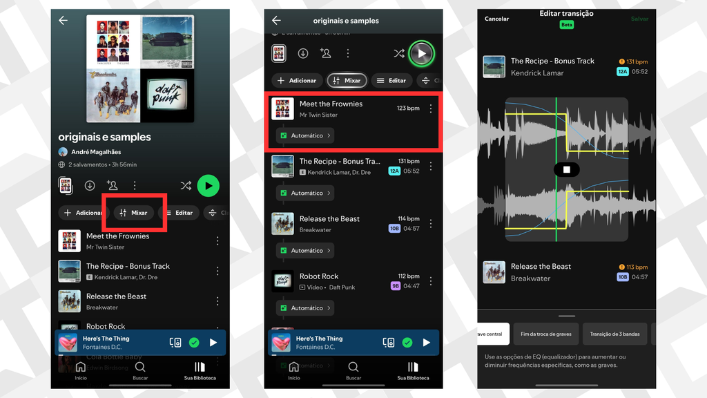 Cada pessoa pode usar as mixagens apenas nas playlists que ela mesma criou, colaborativas ou não. Não é possível usar a ferramenta em playlists de terceiros, mixes ou retrospectivas do Spotify.