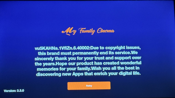 My Family Cinema e outros apps similares mostraram mensagem de erro após fim dos serviços (Imagem: Reprodução/X)