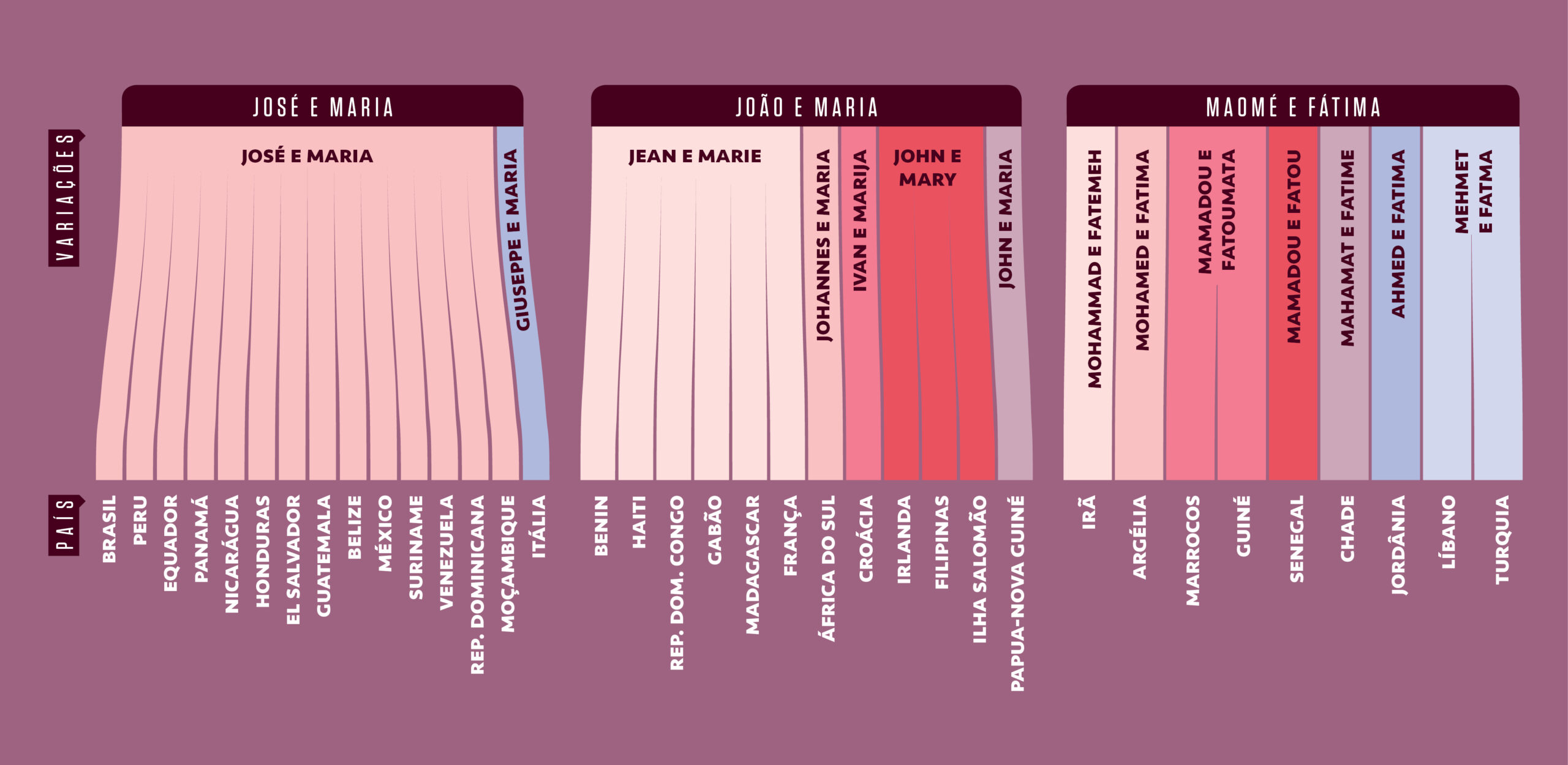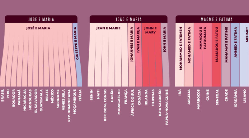 Quem navega pelos dados dos países pode descobrir padrões interessantes na composição de nomes e sobrenomes – José e Maria são os dois nomes mais populares do Brasil, e o hit se repete na maioria dos países da América Latina. Outras duas duplas de origem religiosa se destacam: João e Maria, e Maomé e Fátima. Confira abaixo as variações de grafia dos nomes pelo mundo.