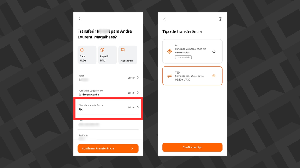 O TED exige mais informações que o Pix e pede os dados da conta bancária de quem vai recebê-lo. É necessário informar: