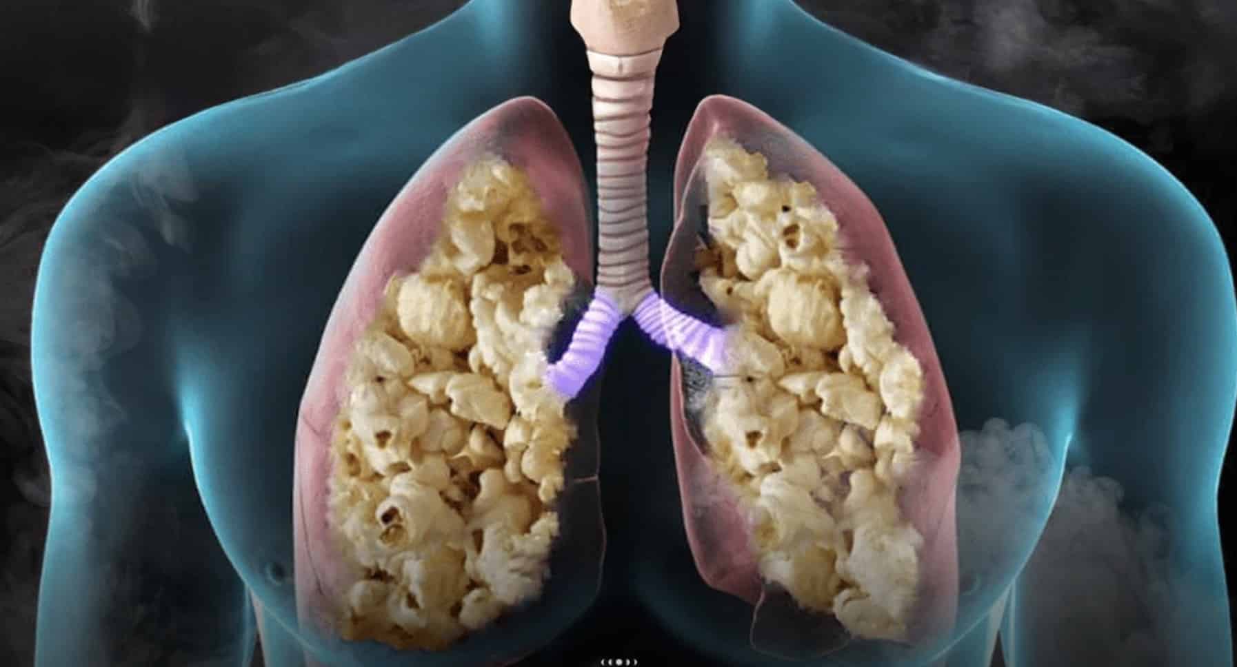 O nome popular está ligado ao diacetil, um aromatizante com sabor amanteigado usado na pipoca industrial. A inalação prolongada desse composto foi associada ao desenvolvimento da doença em trabalhadores expostos aos vapores da substância por longos períodos. Embora a ingestão não apresente os mesmos riscos, estudos demonstraram que a exposição inalável pode causar inflamação e cicatrizes irreversíveis nas pequenas vias aéreas.
