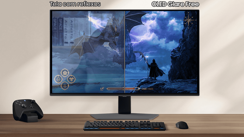 Outro destaque é a tecnologia Glare Free, que, de acordo com a Samsung, reduz os reflexos da tela em 54% em comparação com o filme antirreflexo convencional. Aliado ao Glare Free, o Samsung Odyssey OLED G6 500Hz conta com certificação VESA DisplayHDR True Black 400, que permite ao monitor exibir pretos ultraprofundos e pico de brilho de 1.000 nits.
