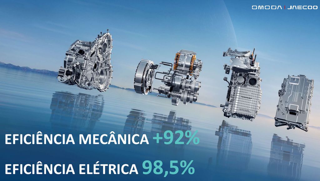 O sistema super-híbrido do Jaecoo 7 é formado por um motor a combustão 1.5 turbo e outro elétrico. Eles trabalham com o câmbio automático DHT de terceira geração e, juntos, entregam 339 cv de potência máxima ao motorista.
