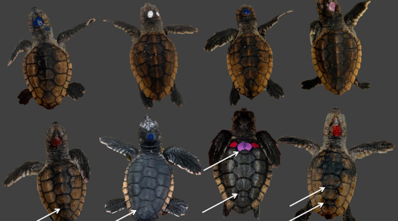 A fileira superior de filhotes de tartaruga-cabeçuda apresenta padrões normais de escamas em suas carapaças, enquanto a fileira inferior mostra filhotes com anomalias, conforme indicado pelas setas.Ivana Lezcano, Florida Atlantic University/Reprodução