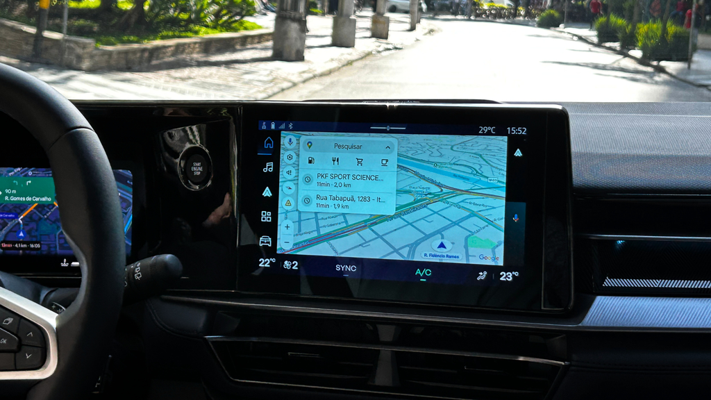 No caso do Maps, o aplicativo de localização é integrado ao sistema e ainda pode ser usado em ambos os painéis do veículo. A Play Store, por sua vez, traz um acervo de aplicativos adaptados para interfaces automotivas, incluindo streamings, jogos e até o WhatsApp.