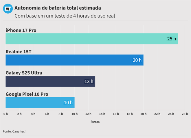 Tudo depende de fatores como configurações de brilho, taxa de atualização e conectividade (Bluetooth e Wi-Fi ligados, por exemplo), etc. Sendo assim, na prática, os números podem variar para menos ou mais.