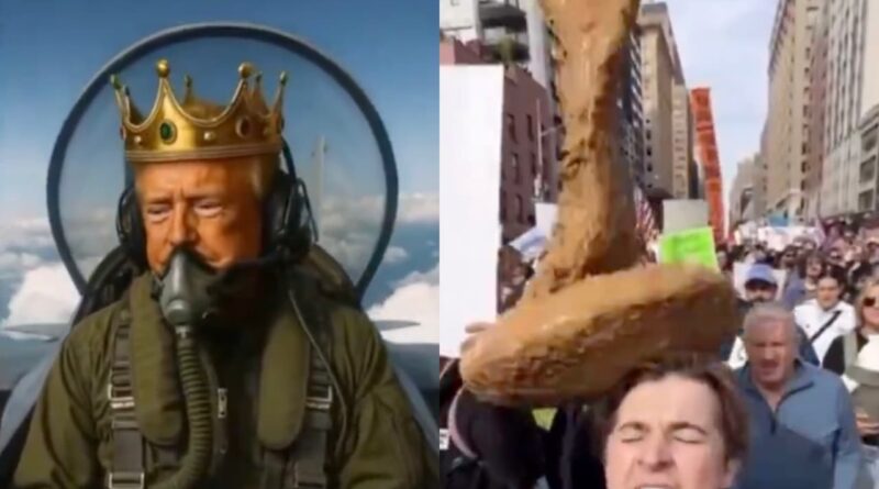 Trump posted an AI video of himself wearing a crown and dumping shit from a “King Trump” jet on No Kings protesters.