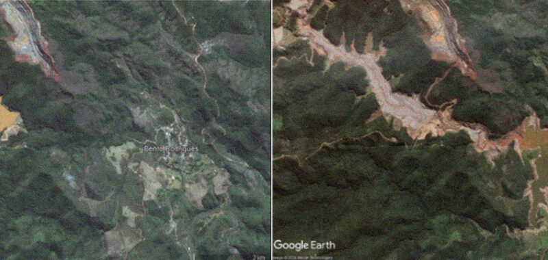 Imagens de satélite da região próxima à Barragem do Fundão em julho de 2015 (antes do colapso da barragem) e junho de 2016 (após o colapso da barragem).Google Earth/Reprodução