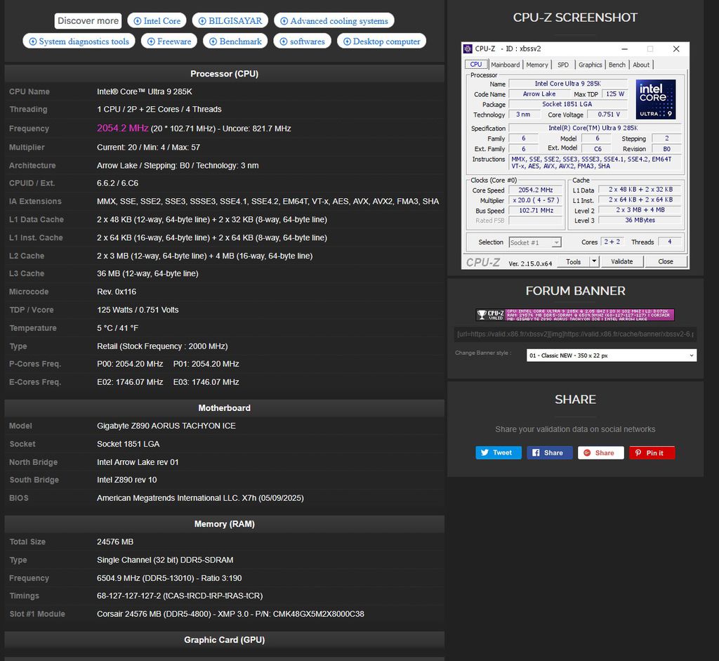 O novo recorde mundial foi alcançado com módulos Corsair Vengeance em uma placa-mãe Gigabyte Z890 AORUS Tachyon ICE, um modelo topo de linha feita para extrair o máximo dos componentes. Fechando a configuração principal, a máquina ainda conta com o melhor processador da Intel atualmente, o Core Ultra 9 285K, CPU de 24 núcleos, mas que usava somente quatro deles para o experimento para uma maior estabilidade.