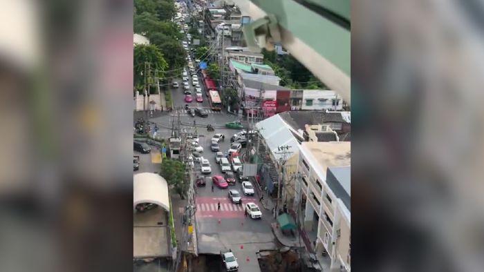 Parte de uma rua em Bangkok desabou na quarta (24) e deixou uma grande cratera que por pouco não engoliu uma Toyota Hilux estacionada por perto. Foi necessário evacuar as construções próximas do local do incidente e dois veículos caíram na área.